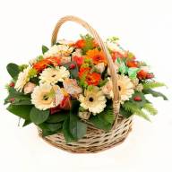 Эта милая корзинка наполнена розами и гермини (маленькие герберы). Сочетаясь в одной композиции, цветы отлично дополняют друг друга и создают уникальный красивый внешний вид. Роза – известный всем символ любви и преданности, а гербера – это легкость, улыбка и тайна. Такая корзина, подаренная по поводу и без, придется по вкусу, как друзьям, так и любимой девушке.